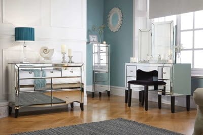 This classically designed 4 Drawer Dressing Table is constructed from a MDF frame and features a mirrored finish with bevelled edges and elegant mock crystal handles.